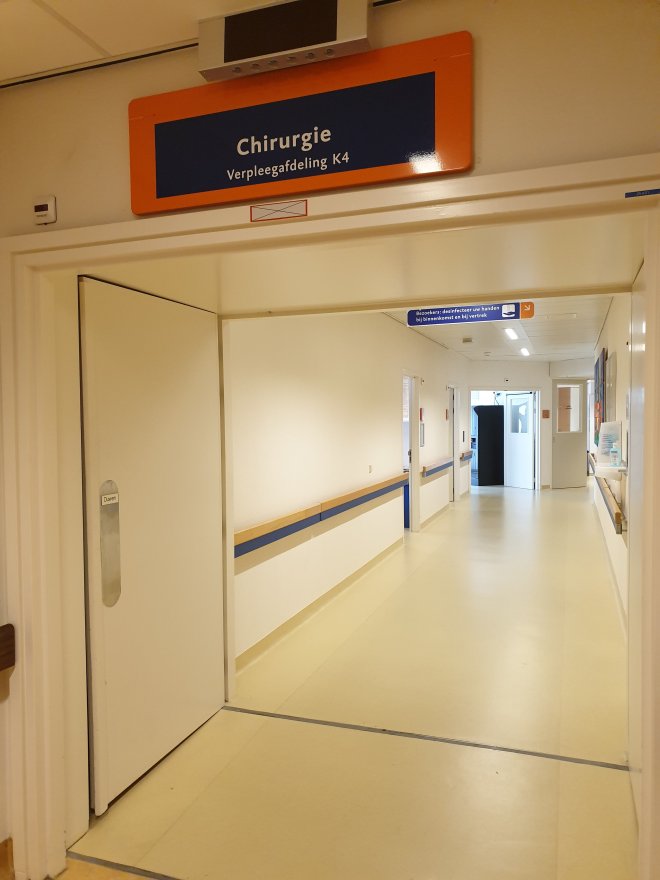 Vanuit de KNO door naar afdeling K4 (de opname afdeling). Bij de balie kreeg ik mijn bed toegewezen op kamer 33. Een mooie ruime 4-persoonskamer met uitzicht op de Mc Donalds en Ikea.  Ook nog een intake gesprek en wat vooronderzoek door een arts in opleiding. Gelukkig hoefde ik er niet meteen te blijven. Ik heb mijn spulletjes in m’n kast gelegd en ben met Peter nog even naar buiten gegaan.