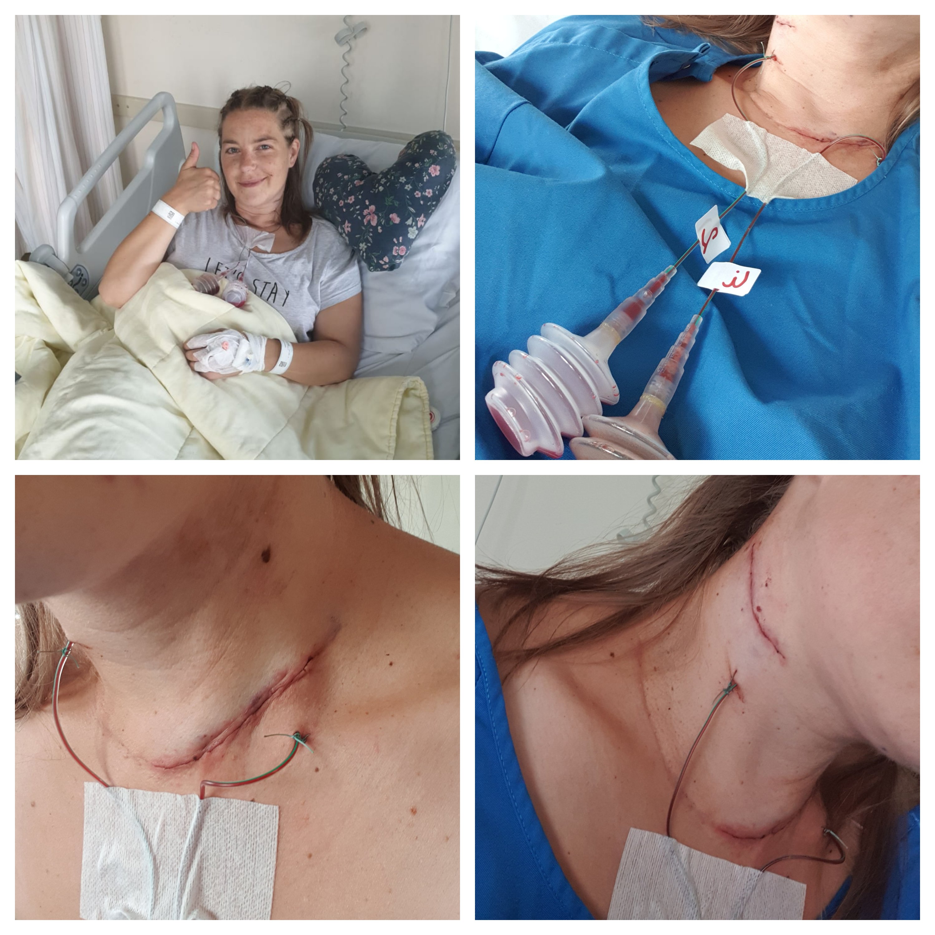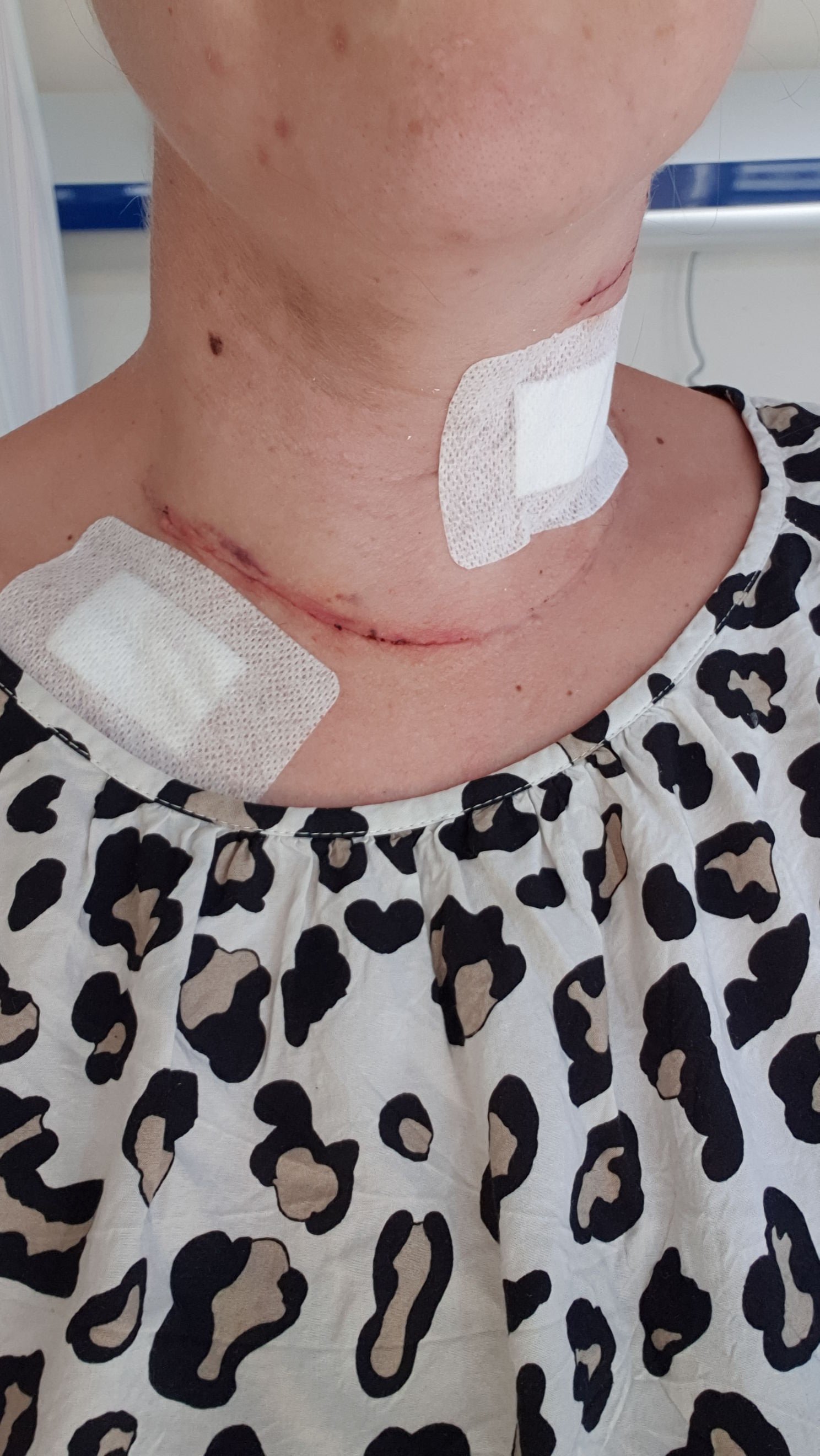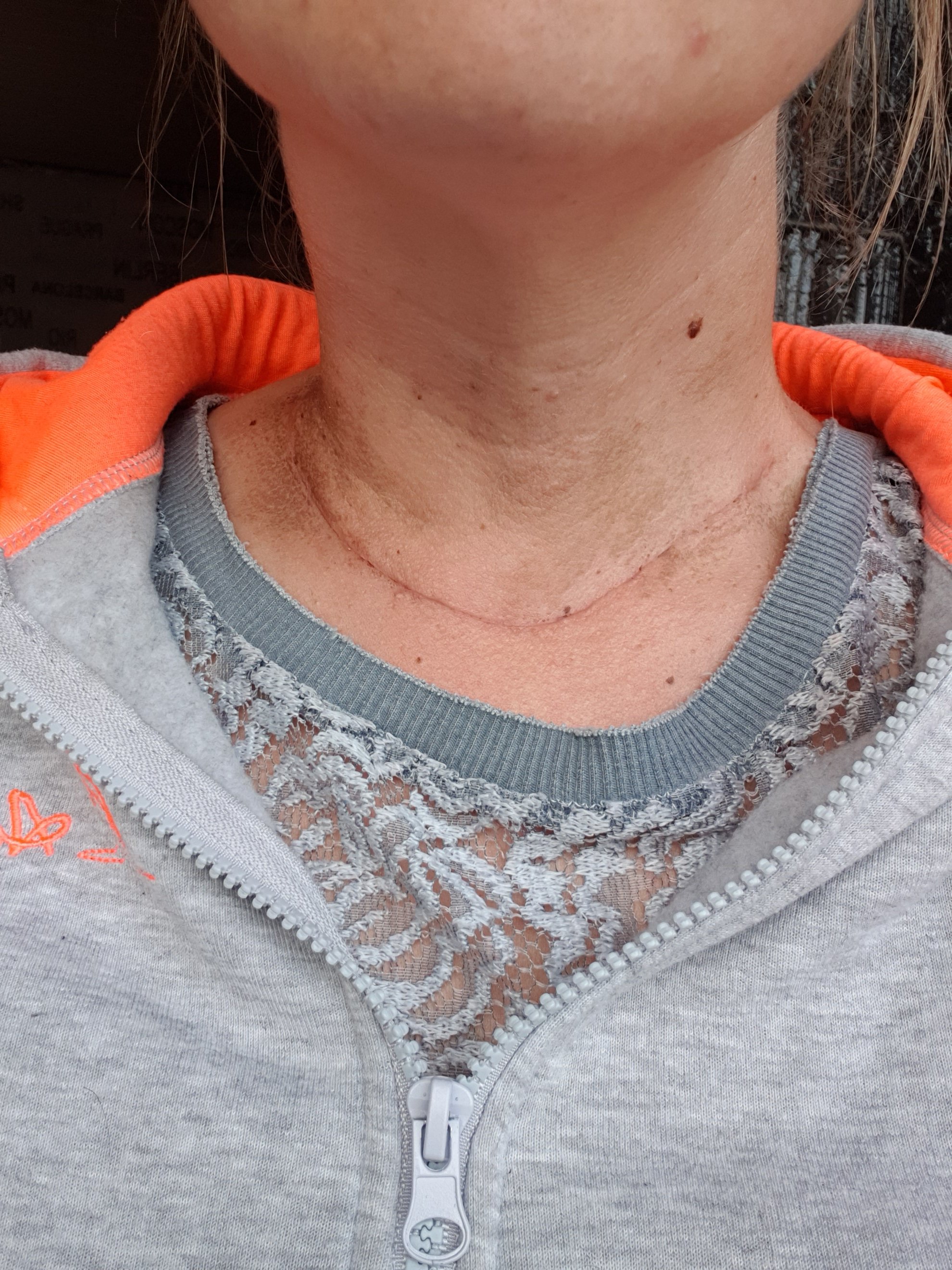 Inmiddels alweer een poosje thuis, herstellende van de operatie. De wond heelt erg mooi. Helaas krijg ik wat donkere vlekken in de huid rondom de wond, waar dit aan ligt is nog onbekend. De een zegt dat het een ophoping van huidcellen zijn, de ander zegt dat het door de schommeling van schildklierhormonen komt.