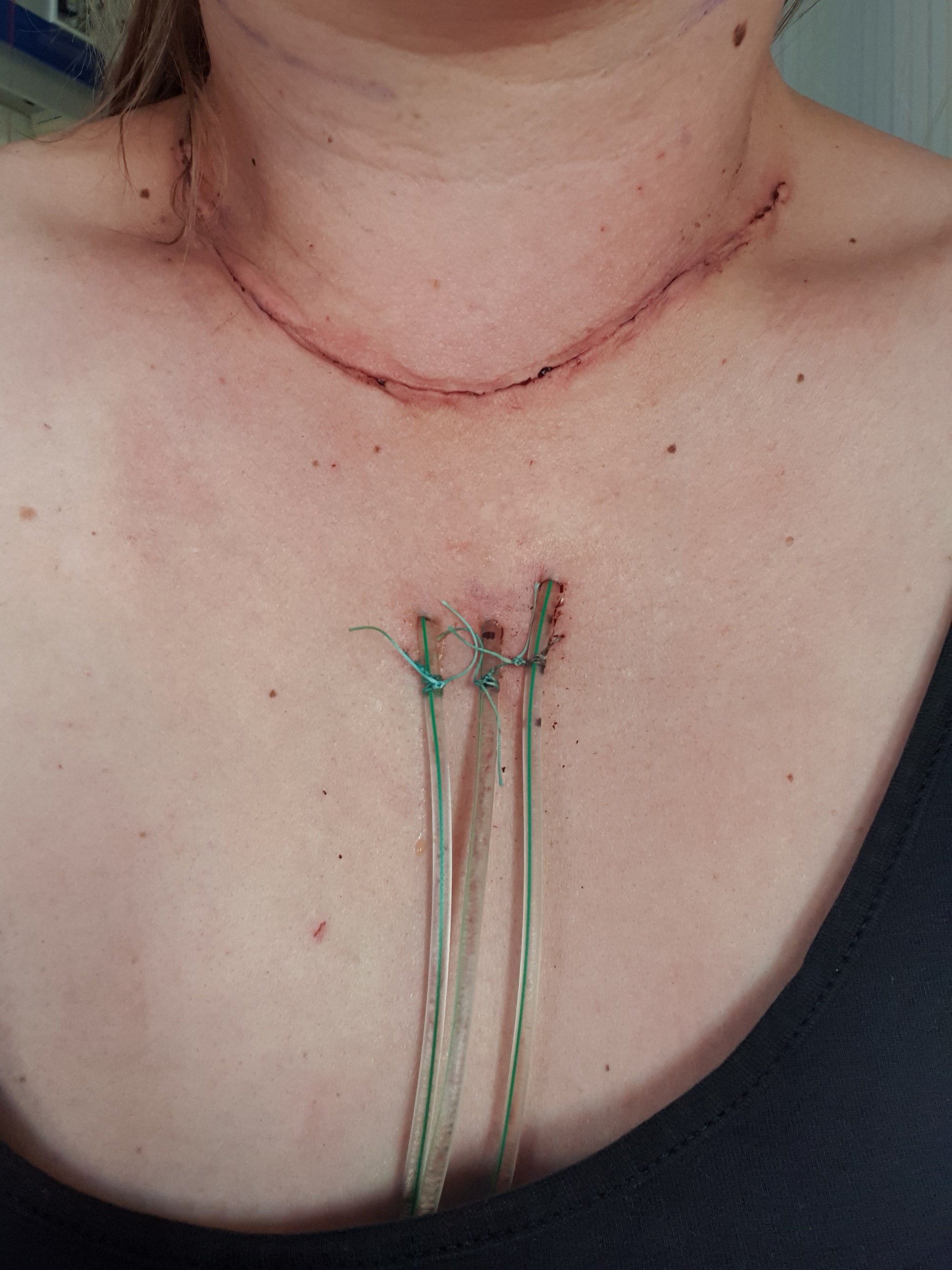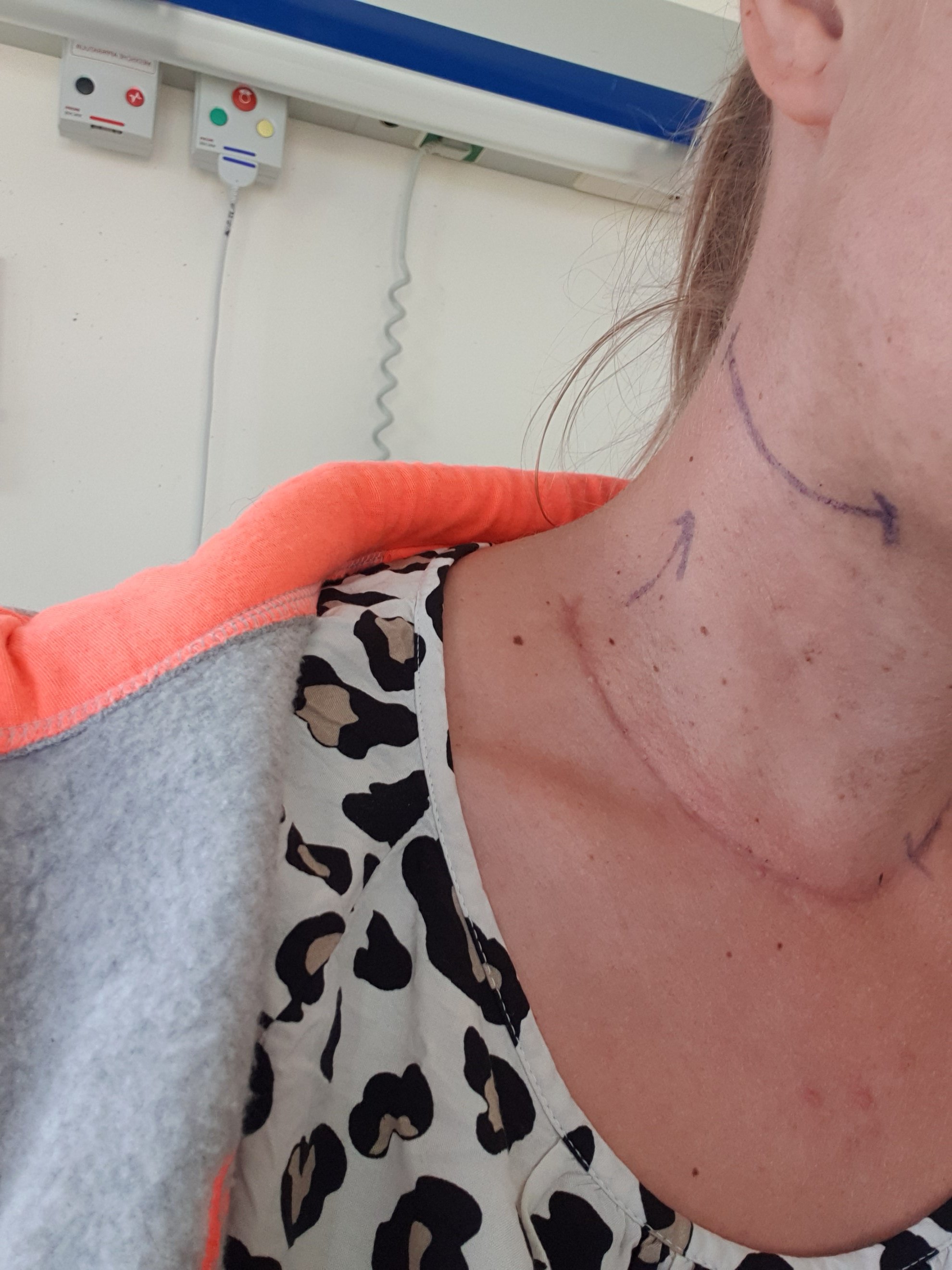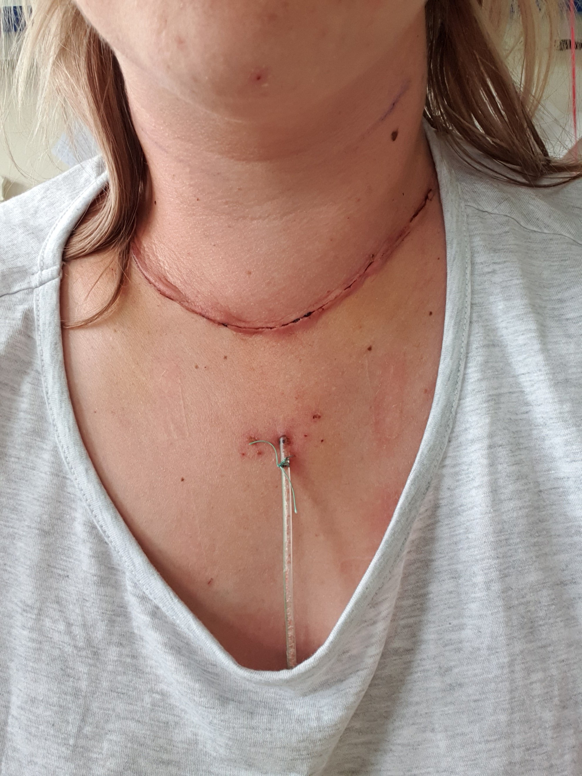 Inmiddels alweer een poosje thuis, herstellende van de operatie. De wond heelt erg mooi. Helaas krijg ik wat donkere vlekken in de huid rondom de wond, waar dit aan ligt is nog onbekend. De een zegt dat het een ophoping van huidcellen zijn, de ander zegt dat het door de schommeling van schildklierhormonen komt.