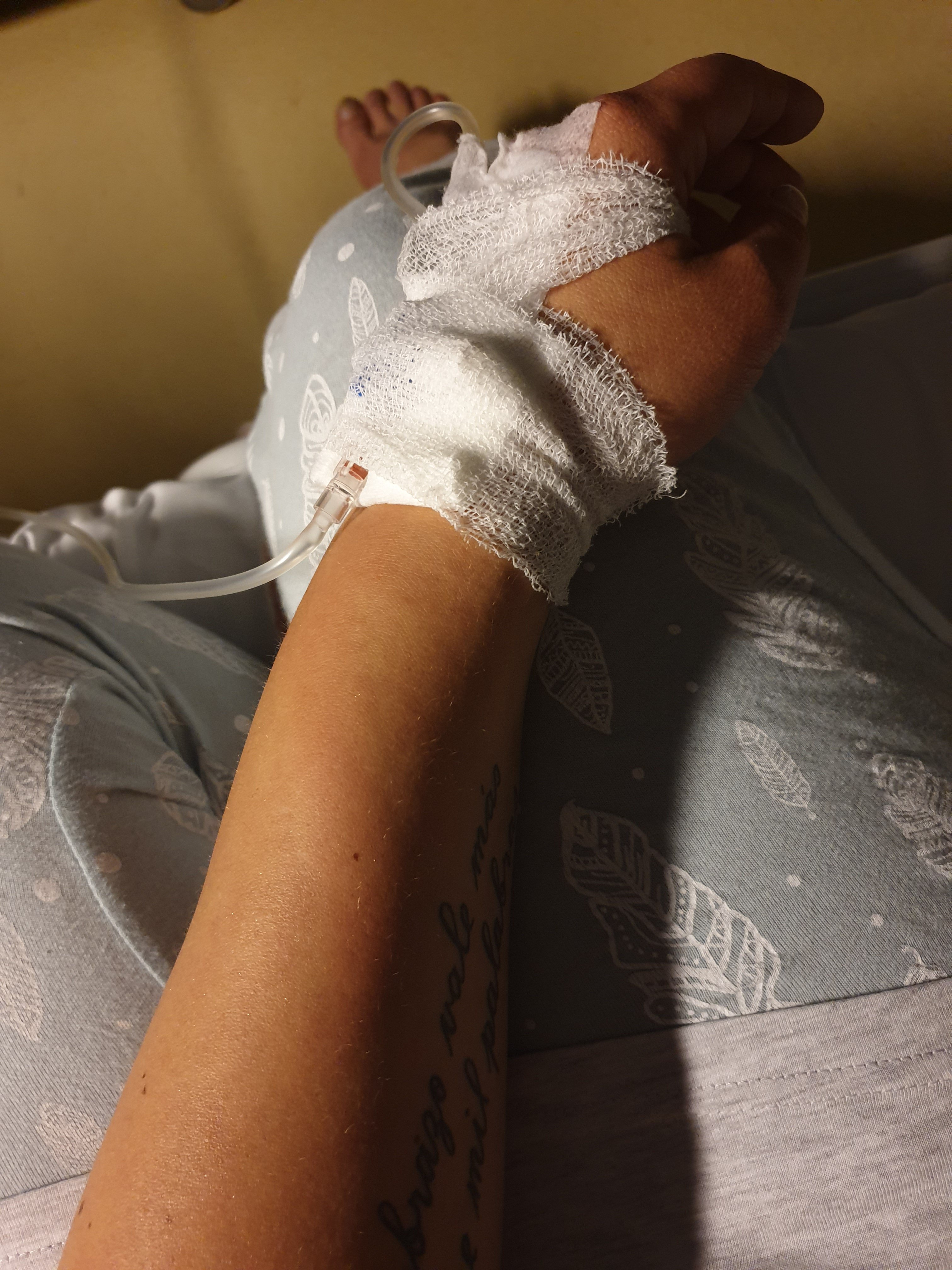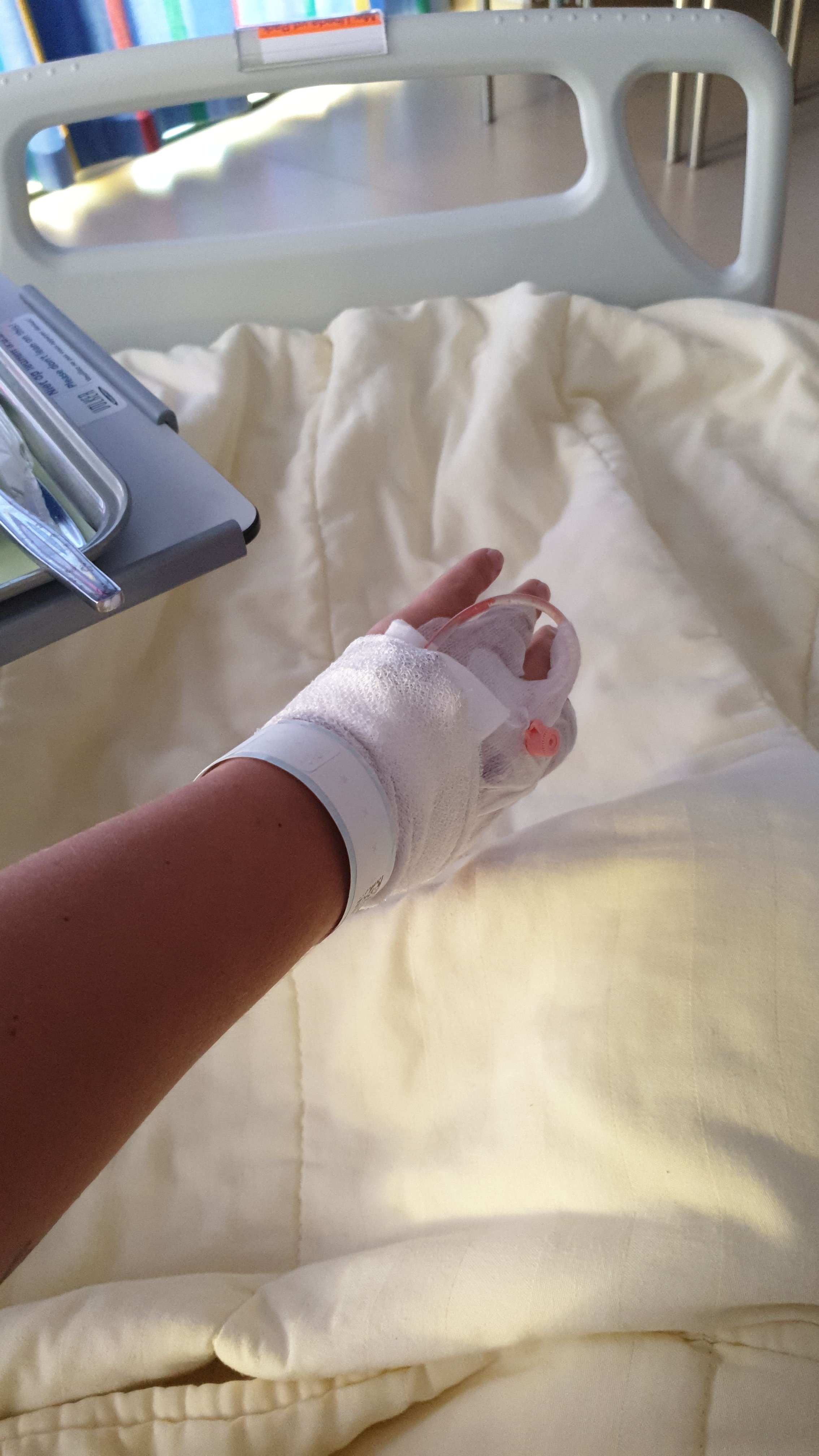 Rond half 1 s’nachts word ik wakker met een zeer pijnlijke linkerarm. Hij is ook erg dik en opgezet. Ik druk op de bel en de verpleegkundige komt kijken. Ze zegt te denken dat het infuus uit mijn aderen gelopen is, maar wil eerst overleg met de dienstdoende zaal arts.