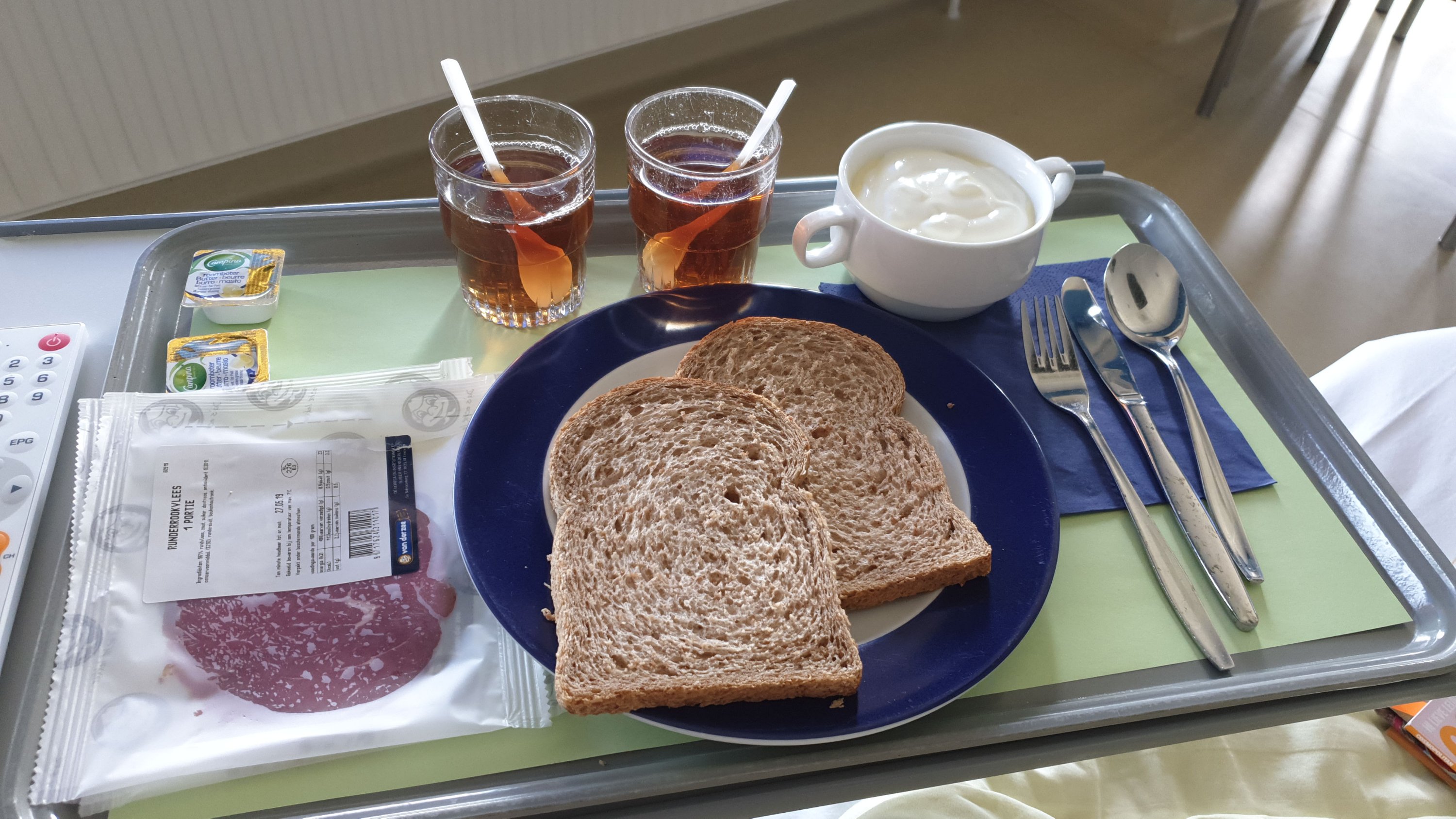 Ik hoor een vrolijke goedemorgen en kijk door de spleetjes van mn ogen naar de dame naast mijn bed en naar de klok. Het is pas 6 uur in de morgen! De dame zet een plastic bekertje naast mijn bed met daarin een hele dosis medicatie. Ze zegt dat ik die pas in hoef te nemen als ze komen voor het ontbijt. Ik besluit nog even door te slapen, tis nog wel erg vroeg. Om kwart over 7 komt de volgende vrolijke dame de kamer in en vraagt wat ik wil eten. Ik ontbijt s’morgens nooit, dus moet er even over nadenken. Doe maar 2 bruine broodjes, 1 met kaas en 1 met iets van vleeswaren. De voedingsmevrouw begint een hele opsomming van alle soorten vleeswaren die er allemaal zijn. De lijst is eindeloos. Uiteindelijk besluit ik rookvlees te nemen. Of ik er nog een bakje yoghurt bij wil en wat ik nog wil drinken. Wat een luxe! Ik merk dat ik in het juiste all-inclusive hotel verblijf.