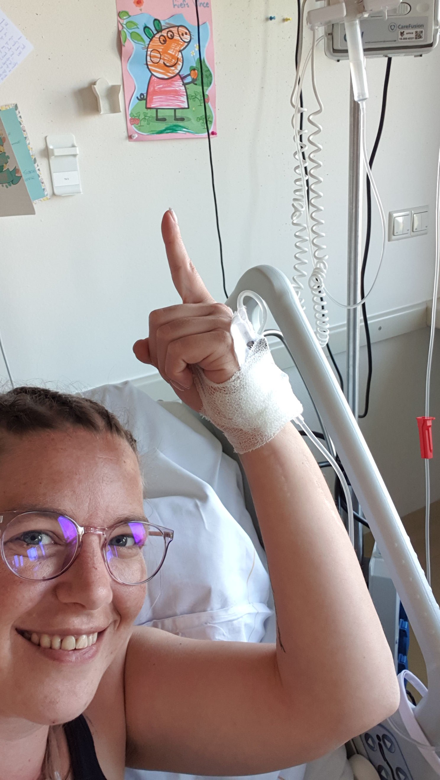 Dag 7 dat ik er lig en wie staat er weer naast mn bed? Juist, dokter blij ei met zn hele gevolg. Ze geven aan dat de labresultaten goed zijn en dat de wond er ook keurig uitziet. Dus ik vraag bijdehand of ik al naar huis mag😊 Helaas was dat dan net weer even teveel van t goede! Als alles 24 uur blijft zoals t nu is mag ik morgen naar huis! Dokter blij ei gaat verder en zijn co-assistent Niels (heet ie geloof ik) blijft nog even praten over hoe ik me voel enzo. Ook legt hij uit dat t echt geen goed idee is om vandaag al naar huis te gaan. Oké ik geloof hem..nog 1 nachtje volhouden…