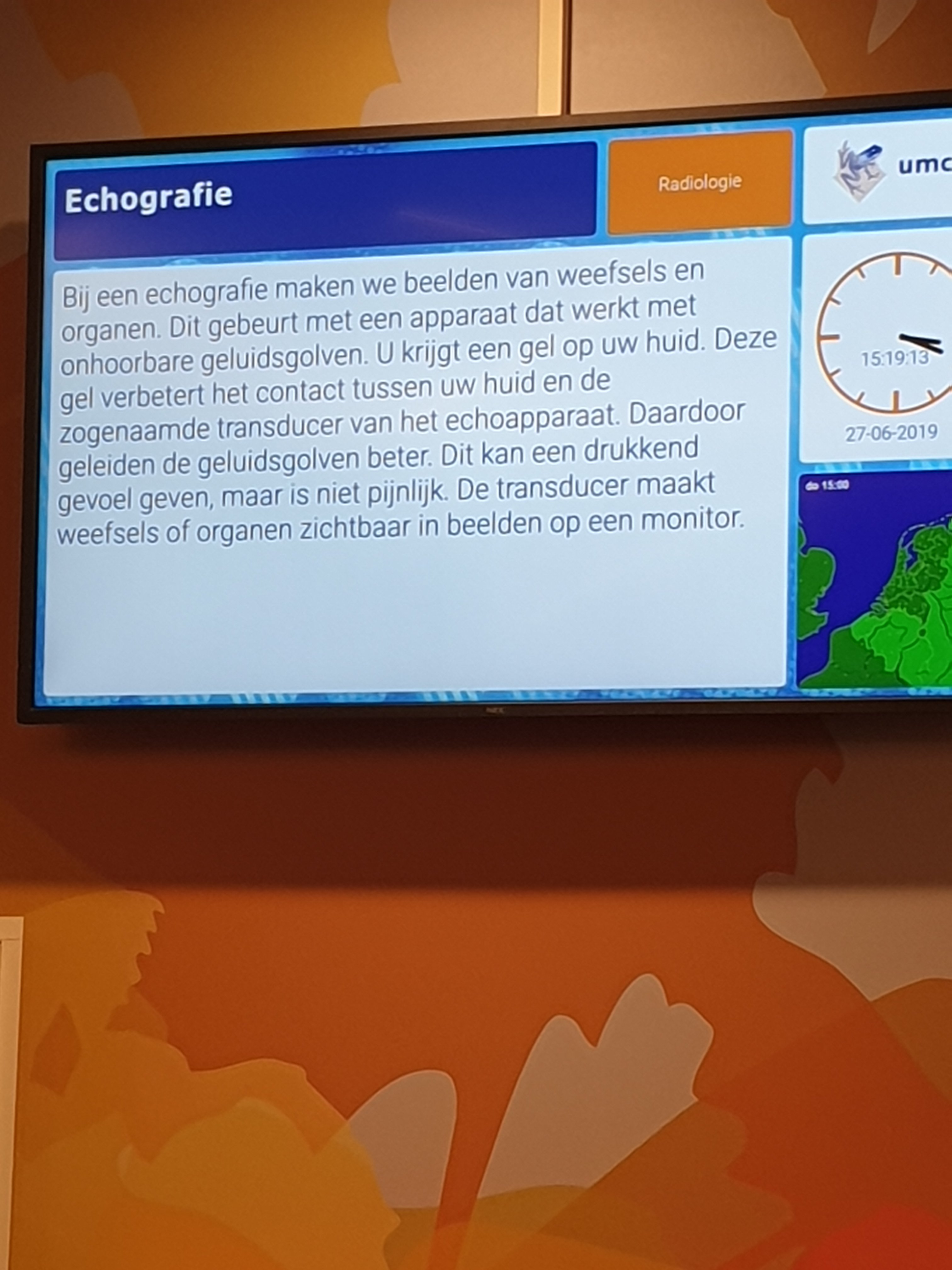 Het is maandag 15 juli en ik word gebeld door het UMCG. ‘Mevrouw Ubeda van der Park, ik weet niet of u het al gezien heeft in de UMCG-app, maar wij hebben de echo en punctie voor u kunnen inplannen op donderdag 18 juli om 10 over 12’. Het UMCG heeft een app, en in die app kun je je afspraken inzien, onderzoeksverslagen, uitslagen van het afgenomen bloed, brieven die ze naar de huisarts sturen en de mogelijkheid om de arts een bericht te sturen. Erg handig dus. Ik had de nieuwe afspraak nog niet gezien, maar geef aan dat ik er zal zijn. Ik bel meteen het taxibedrijf om de rit vast te leggen.
