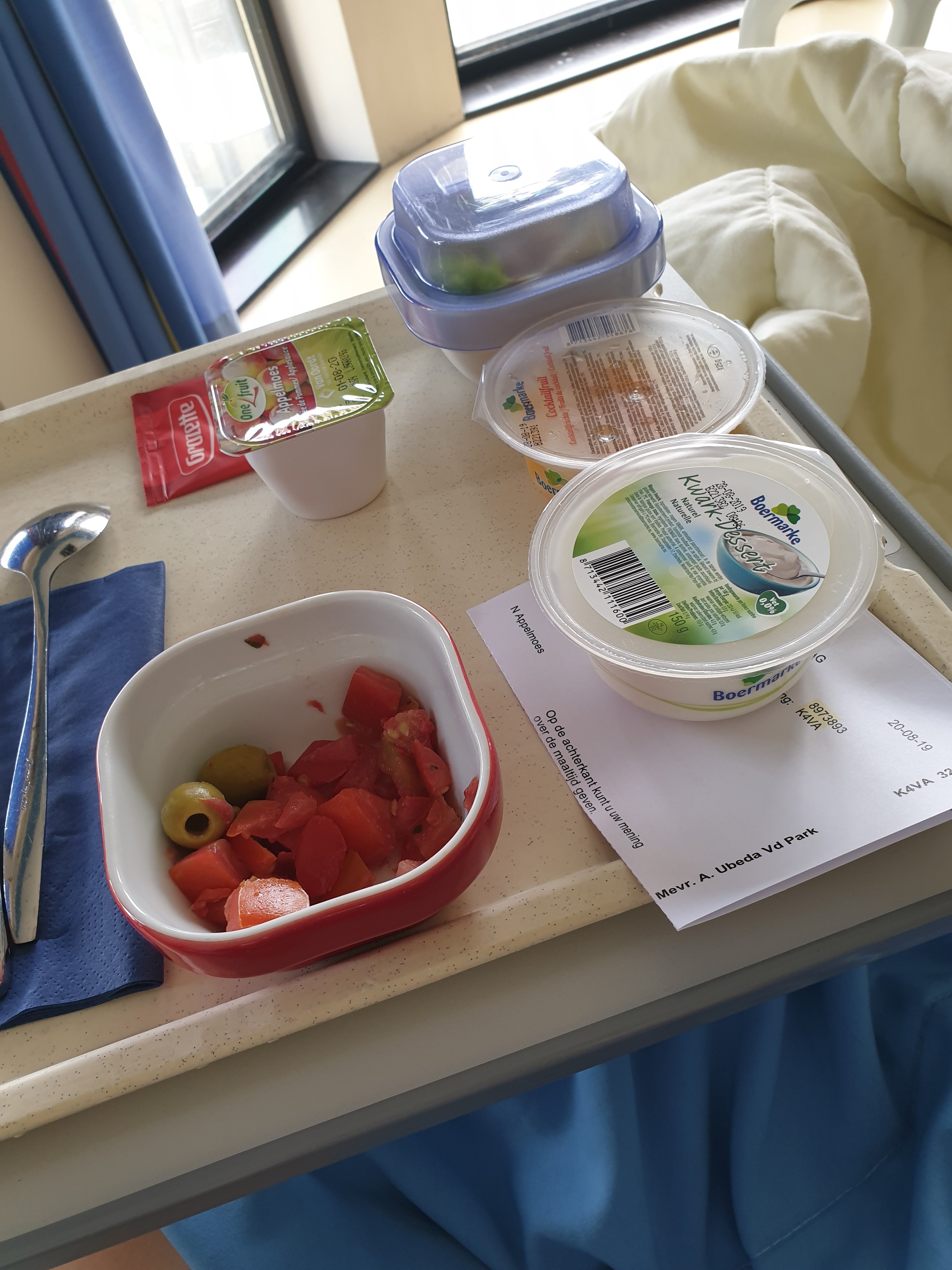 Na een mooie wandeling weer terug op de opnameafdeling K4VA kamer 33. Ik krijg nog een patiënten bandje, aan iedere arm 1. Mijn All-inclusive zal hier starten, met als eerste diner iets wat ik echt totaal niet lekker vind, zuurkool. Gelukkig zat er ook een salade bij en een toetje. Daarnaast had ik s’ middags met Peter al een flink broodje Hamburger gegeten, dus ik zat nog wel redelijk vol.