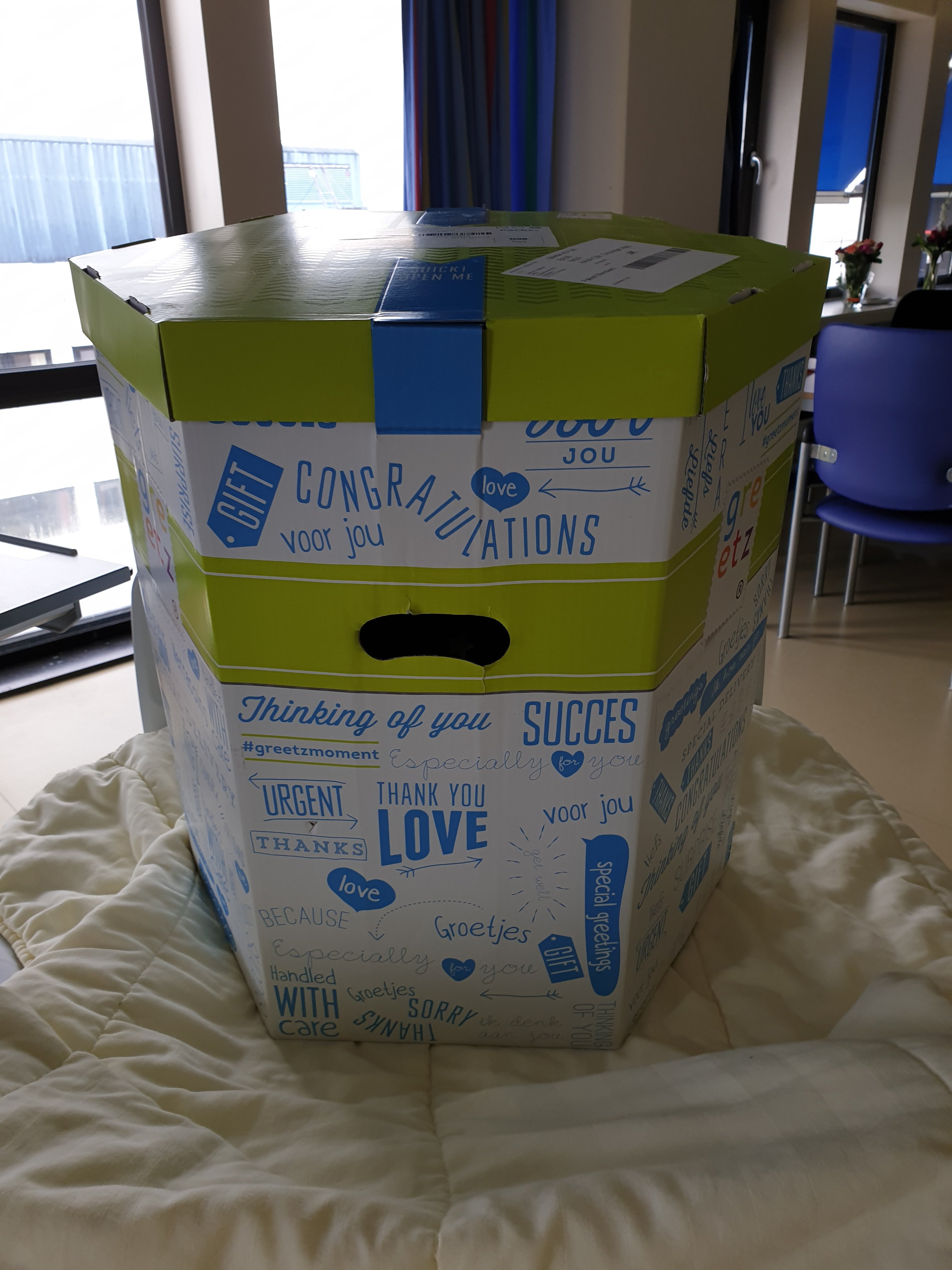 Tijdens de koffieronde kreeg ik een grote glimlach op mn gezicht toen ze de post kwamen brengenFanmail!! Gister ook al een kaartje! En alsof t nog niet genoeg was…Superlief weer!!😊 bedolven onder een stapel kaarten en balonnen voelde ik me erg goed die dag, al had ik nog wel veel pijn in mijn hals.